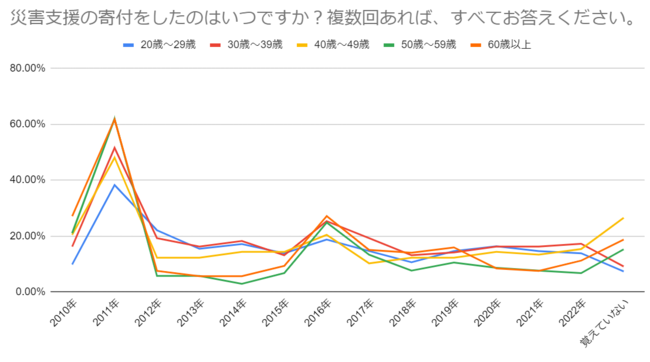 4) いずれの年代でも、2010年以降寄付した年で最も多いのは東日本大震災の起きた2011年。40代以上は、大きな災害が起きた年に寄付する傾向があった。一方、20代と30代は各年での寄付経験の分布に比較的ばらつきがなかったため、災害の規模にかかわらず例年継続して寄付する傾向が見て取れる。