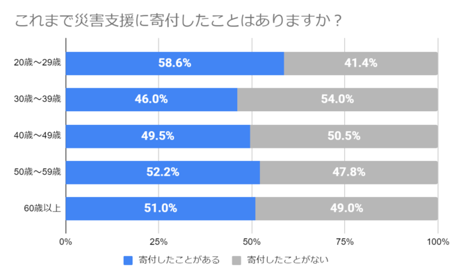 ◆ 災害支援の寄付経験が最もあるのは20代で、約6割。次いで50代が約半数。