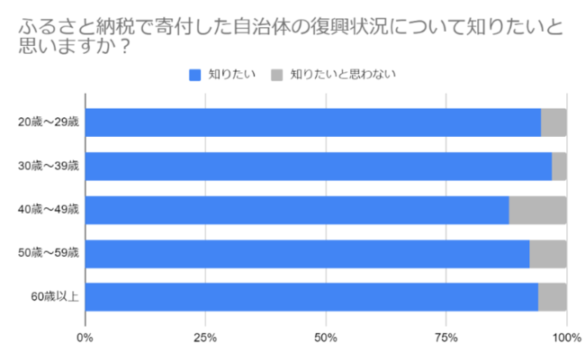 8) ふるさと納税で寄付した自治体の復興状況について知りたいと思う人の割合が多い世代は30代が最多で96.9%、次いで20代が94.6%だった。ふるさと納税で寄付した自治体の復興状況について知りたい場合の手段を尋ねたところ、20代、30代は他の世代に比べSNSや現地に住む親族・友人知人の話など、個人的なエピソードを知ることのできる手段を選ぶことが分かった。