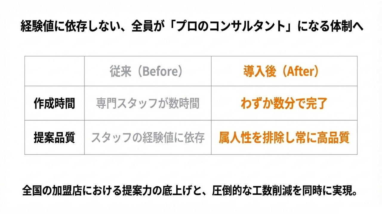 ・提案品質の担保: スタッフの経験値に左右されず、常に高いレベルでの収益提案が可能になり、全国の加盟店における提案力の底上げを実現しました。