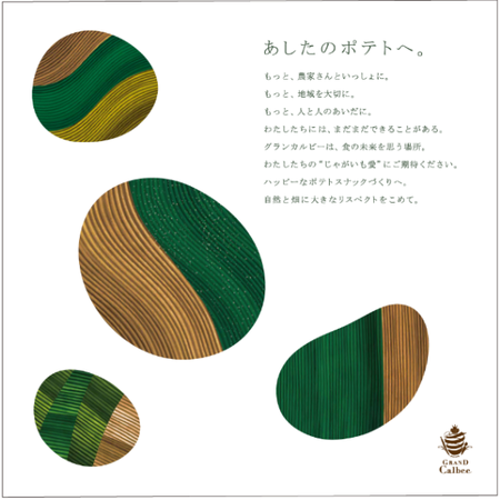 今回のリニューアルに伴い『グランカルビー』は新しいキービジュアルとステートメントをリリースします。ばれいしょ事業に携わってくださっている農家のみなさんや地域のみなさん、そしてじゃがいもへの敬意を込めて、ハッピーなポテトスナックづくりをお客様とお約束する象徴となるビジュアルです。主要な産地である北海道のじゃがいも畑の4輪作をイメージし、四季の移ろいや光の当たり具合できらめく様子を表現しました。