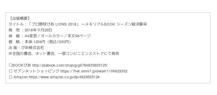 9月26日、ぴあ株式会社より『「プロ野球ぴあ LIONS 2018」 〜メモリアルBOOK シーズン総決算号』が発売となります。