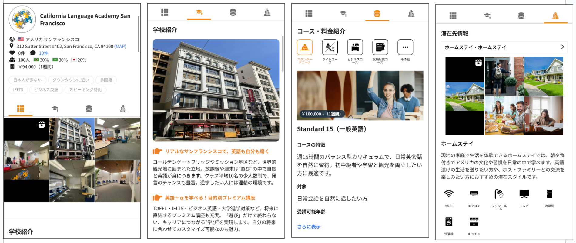 ネイティブキャンプ留学では、ユーザーが必要な情報を分かりやすく把握できるよう、常に丁寧で明確な情報提供を心がけています。California Language Academyの詳細情報は、以下の4つのカテゴリーに分けて掲載しており、知りたい情報を的確にお届けします。