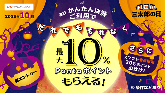 2023年9月に引き続き10月も、「三太郎の日」に「auかんたん決済」を利用すると、Pontaポイントがもらえるキャンペーン(※)を、 実施します。auスマートパスプレミアム会員なら、さらにおトクになるキャンペーンです。※ 一部のサービスは対象外となります。