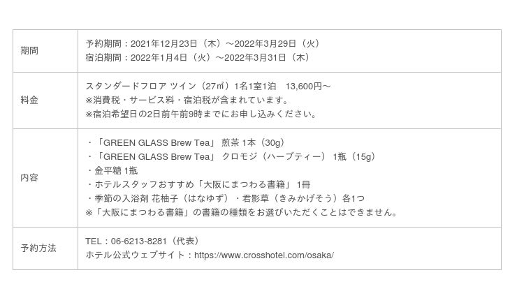 「ORIX HOTELS & RESORTS」ブランドのシティホテル「クロスホテル大阪」(所在地:大阪市中央区、総支配人:若山 智)は、2022年1月4日(火)〜2022年3月31日(木)の期間、ハンドドリップで入れたお茶を味わいながら、ホテルスタッフおすすめの本を楽しむ宿泊プラン「私だけの時間〜日本茶を楽しむゆったりステイ〜」の予約受け付けを、本日より開始しますのでお知らせします。