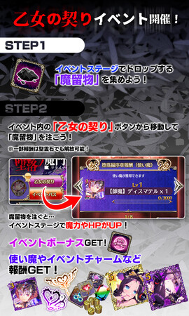 イベントステージでドロップするアイテム『魔留物』を集め、イベント画面内にある「乙女の契り」ボタンから『魔留物』を注ぐと、期間中のイベントステージで様々な効果を発動します。