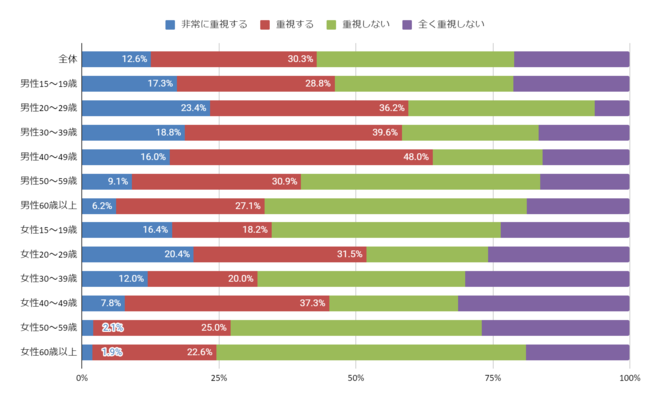 男性と比べて全体的に割合は低いですが、女性20〜29歳も51.9%と過半数を超える人が重視をしているようです。