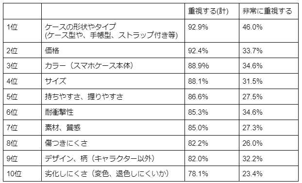 1位「ケースの形状やタイプ」92.9%、2位「価格」92.4%、3位「カラー」88.9%。