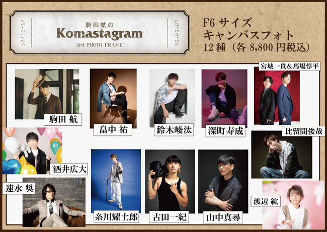 番組内で撮影されたゲスト声優の未公開カットに駒田さん自身の撮り下ろしグラビアやインタビューなども収録された番組公式フォトブックの第三弾『駒田航のKomastagram 3rd PHOTO FRAME』が本日発売! 今回は畠中祐、鈴木崚汰、馬場惇平&宮城一貴、速水奨、酒井広大、比留間俊哉、渡辺紘、深町寿成、山中真尋、糸川耀士郎、古田一紀、KENNといった人気声優・俳優陣の写真を収録。さまざまなシチュエーションで撮影された、駒田航だからこそ引き出せる表情が満載となっている。