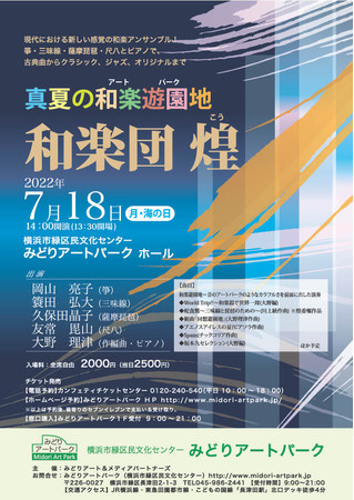 みどりアート&メディアパートナーズ主催、『真夏の和楽遊園地 〜和楽団 煌Koh』が2022年7月18日(月)に横浜市緑区文化センター みどりアートパーク ホール(神奈川県横浜市緑区長津田2-1-3)にて開催されます。