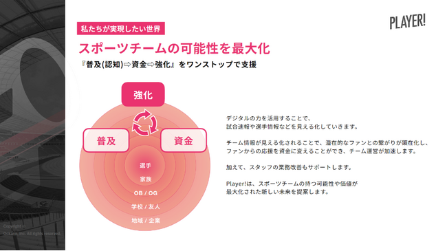 ??事業内容:スポーツコミュニティアプリ「Player!」および「Player! WHITE」の開発・運営、スポーツ情報インフラの開発・運営