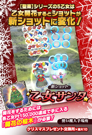 【聖楽】シリーズの5乙女は、使い魔を強化できる乙女開花を行うとクリスマス特別新ショット「乙女サンタ」にショットが変化します。