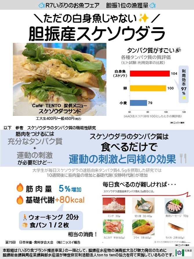 胆振総合振興局では、管内で水揚げされる水産物の魅力発信を行っており、胆振で最も漁獲量が多く、近年健康効果が明らかになった「スケソウダラ」の身を、室蘭工業大学学生食堂等へ提供します。
