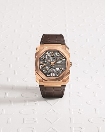 10年足らずで現代の高級時計製造のアイコン的存在となった「オクト フィニッシモ」。印象強い特徴的なフォルムとともに数々の世界記録を打ち立てた伝説的存在です。古代ローマの歴史的建築モチーフに着想を得た「オクト」。8角形が持つ幾何学的なモチーフとベゼルの曲線のコントラストが際立ちます。無駄をそぎ落とした現代的な表情を持つこのコレクションは、高度な時計製造技術とエレガンスという、ブルガリのアイデンティティを体現しています。「オクト フィニッシモ スケルトン エイトデイズ」は、この伝統を完璧に受け継ぎながらゴールドの復活を前面に打ち出しています。