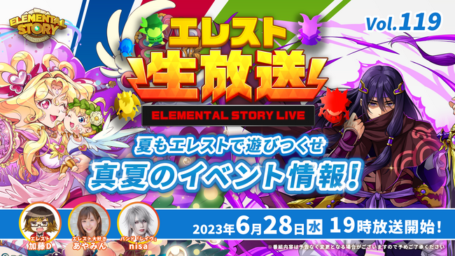 『エレメンタルストーリー』が、エレスト公式生放送vol.119を6月28日(水)19:00より配信!7月から始まる真夏のイベント情報&リアルイベントの情報をお届け!