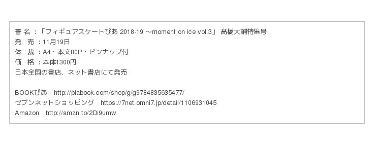 ぴあ株式会社では、先週11月19日に『「フィギュアスケートぴあ 2018-19」 ~moment on ice vol.3 高橋大輔特集号』を発売。好評につき、本日発表の12/3付、オリコン週間BOOKランキング ジャンル別「スポーツ関連」におきまして1位となりました。