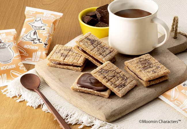 ムーミンママが淹れてくれたホットチョコレートをイメージした『ムーミン シュガーバターサンドの木 ホットチョコレート風』。ココア香るシリアル生地をこんがり焼いて、くちどけなめらかなビターショコラをサンドしました。サクッとかじれば、寒い日にホットチョコレートを飲んだ時のようなホッとする味わいがお口に広がります。あたたかい飲み物と一緒に、ほっこり癒しのティータイムをお過ごしください。