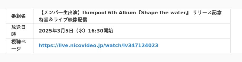 2020年リリース『Real』以来、実に5年ぶりとなる自身6枚目のオリジナルフルアルバム「Shape the water」をリリースするflumpool。リリース日の3/5(水)にニコニコ生放送でメンバー生出演の特番が決定!