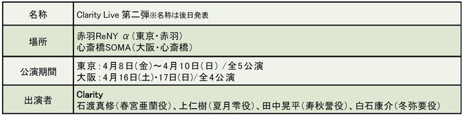 Clarity単独ライブ公演第2弾 4月東京・大阪にて上演!