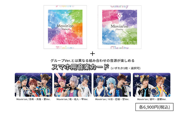 ボルSHOPでは限定で、「Movin’on / 7Colors」「Movin’on / Clarity」のCDセットにスマホ用音楽カードが付いたパックもご用意しております。スマホ用音楽カードは全部で4種類あり、舞台「アニドルカラーズ キュアステージ SHUFFLE REVUE」公演の際に回替わりで披露した組み合わせの「Movin’on」がお楽しみいただける仕様となっております。