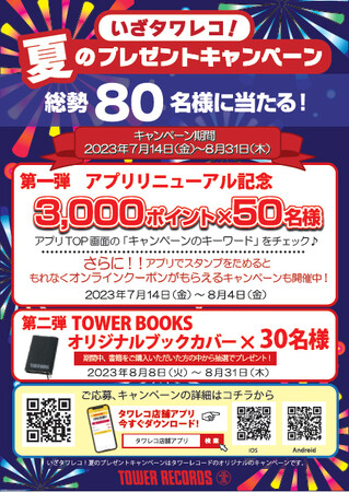 タワーレコードは『いざタワレコ!夏のプレゼントキャンペーン』として、「タワレコ店舗アプリ」リニューアル記念ポイントプレゼントへの応募を受付け中。同キャンペーン第二弾として、8月8日(火)からオリジナルブックカバーの抽選プレゼントをスタートします。