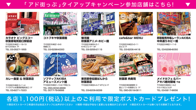 12月8日から1月9日まで、秋葉原の対象10店舗にて1,100円(税込)以上のご利用、または、ご飲食された方に「限定ポストカード」をプレゼントいたします。