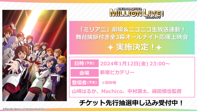 2024年1月12日(金)にBlu-rayの発売を記念して「アイドルマスター ミリオンライブ!」劇場&ニコニコ生放送連動!舞台挨拶付き全3幕オールナイト応援上映会の実施が決定しました。