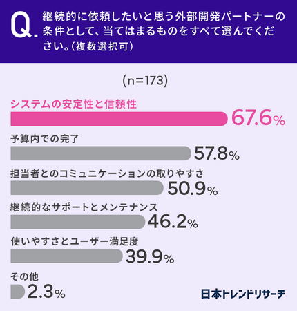 ■継続的に依頼したいと思う外部開発パートナーの条件、67.6%が「システムの安定性と信頼性」と回答