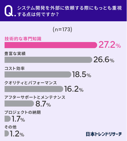 27.2%の方が、システム開発を外部に依頼する際に「技術的な専門知識をもっとも重視する」と回答しています。