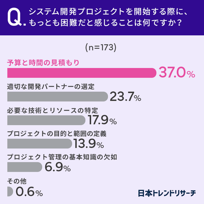 37%の方が、システム開発プロジェクトを開始する際にもっとも困難なのは「予算と時間の見積もり」だと回答しています。