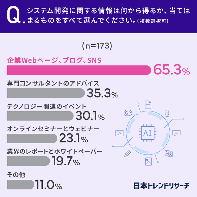 65.3%と半数以上の方が、システム開発に関する情報は「企業Webページ、ブログ、SNSから得る」と回答しています。