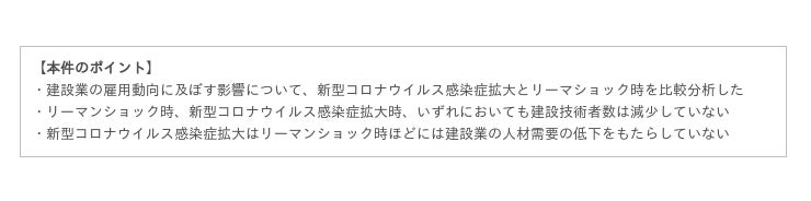 ヒューマンホールディングス株式会社の事業子会社で、人材紹介事業を行うヒューマンタッチ株式会社(本社:東京都新宿区、代表取締役:高本和幸、以下「ヒューマンタッチ」)が運営するヒューマンタッチ総研は、日本経済に大きな打撃を与えている新型コロナウイルス感染症拡大が建設業の雇用動向に及ぼす影響を2008年9月に発生したリーマショック時と比較分析しました。