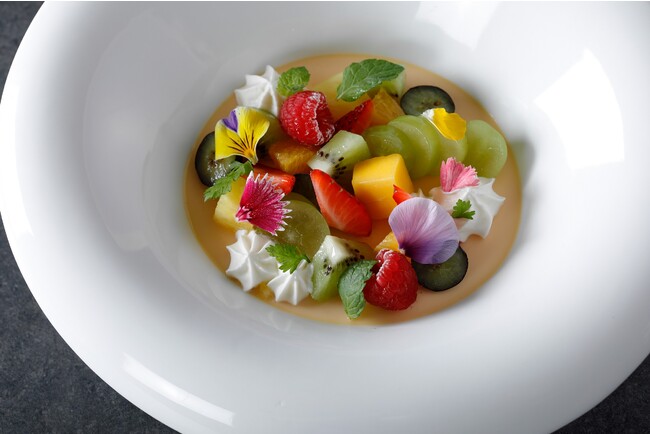 京都・美山の自然豊かな環境で生産される美山牛乳を使用した、なめらかでさっぱりした食感にこだわったプリンをベースに、庭園をイメージした季節のフルーツや花々を繊細に散りばめ、一口ごとに異なるハ-モニ-を演出します。
