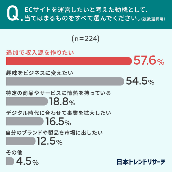 ■54.5%が、ECサイトを運営したいと考えた動機として「趣味をビジネスに変えたい」と回答