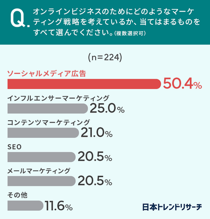 50.4%と半数以上の方が、オンラインビジネスのために「ソーシャルメディア広告」を活用したいと回答しました。