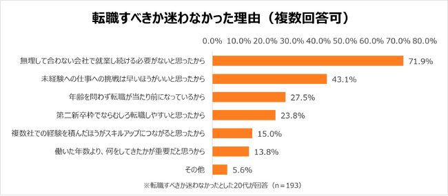 転職すべきか迷わなかった理由は、「無理して合わない会社で就業し続ける必要がないと思ったから」が71.9%で最多。次いで、「未経験の仕事への挑戦は早いほうがいいと思ったから」43.1%、「年齢を問わず転職が当たり前になっているから」27.5%が続きました。