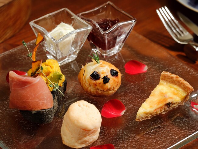かぼちゃスコーン/かぼちゃサラダと生ハムの竹炭パンのブルスケッタ/クロテッドクリーム/