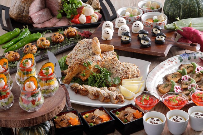 栗や松茸、旬を迎える京の伝統野菜など、秋の実りが楽しめる料理の数々、スイーツにはハロウィーンカラ-に彩られた愛らしいデザインのアイテムが並びます。