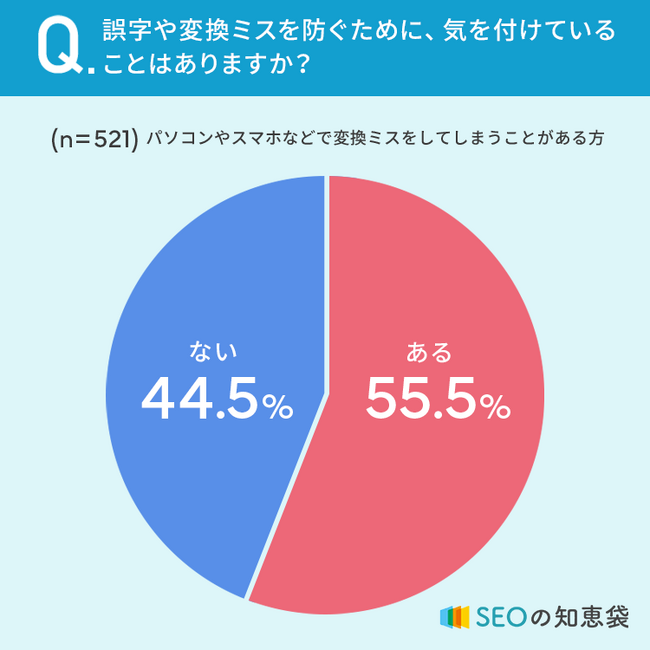 55.5%と半数以上の方が、誤字や変換ミスを防ぐために気を付けていることが「ある」と回答しています。
