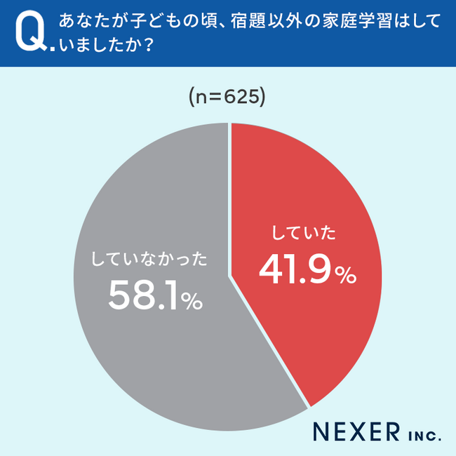 41.9%の方が、子どもの頃に宿題以外の家庭学習を「していた」と回答しています。