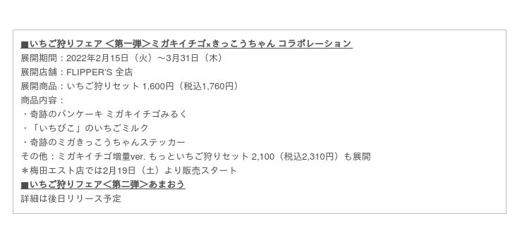 ブランド誕生以来、宮城県白石蔵王の契約養鶏所・竹鶏ファームのたまごを使用、更には2021年より国産フルーツを使用した季節のフェアを展開するFLIPPER’Sが2022年に挑戦するのは、同じく宮城県をルーツに持ついちご『食べる宝石ミガキイチゴ』を使用した限定パンケーキ。同じく仙台生まれのキャラクター『きっこうちゃん』がコラボパンケーキに扮した「奇跡のミガきっこうちゃん」と共に、可愛く美味くFLIPPER’Sらしく地域を応援してまいります。
