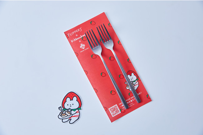 今回のコラボレーションの為に描き下ろしされた限定ステッカーとカトラリーマット。ミガキイチゴをかぶったきっこうちゃんの手には、奇跡のパンケーキ。