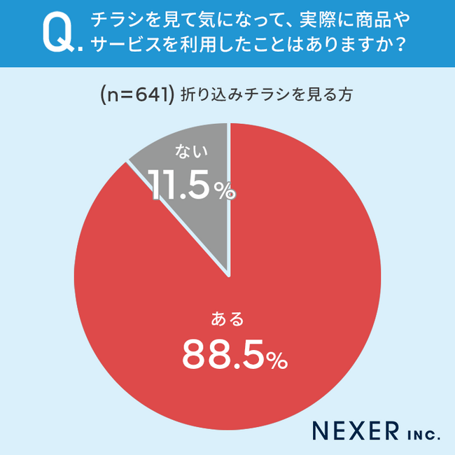 88.5%と9割近くの方が「チラシを見たことで気になって、実際に商品やサービスを利用したことがある」と回答しています。