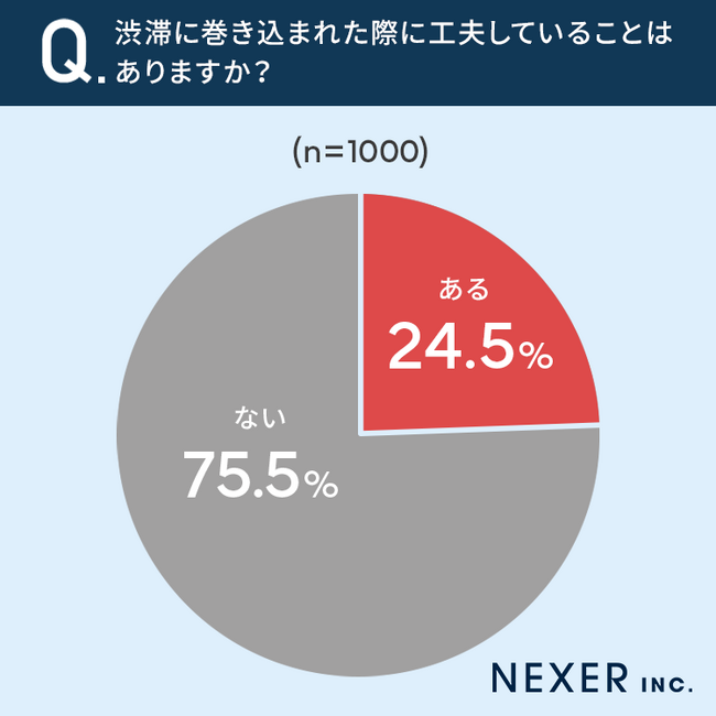 24.5%の方が、渋滞に巻き込まれた際に工夫していることが「ある」と回答しています。