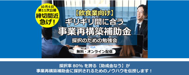 【飲食業向け】ギリギリ間に合う 事業再構築補助金 採択のための勉強会(無料/オンライン)【助成金なう】