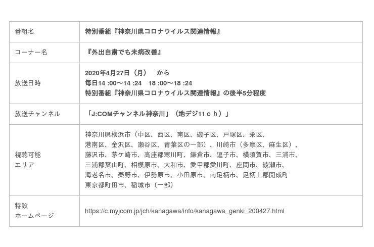 また、緊急事態宣言の解除後には、「J:COMチャンネル神奈川」内の「デイリーニュース」に放送枠を移して継続して放送する予定です。緊急事態宣言の発令後、株式会社ジェイコム湘南・神奈川では、コミュニティチャンネルをはじめ、さまざまな在宅支援のコンテンツを提供しておりますが、神奈川県と連携し制作するコンテンツは、今回が初めての取り組みとなります。