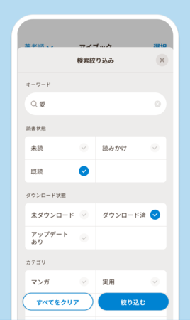 既読/未読といった読書状態やダウンロード済みかどうかといった従来からの条件に加え、ライトノベル/マンガなどのカテゴリ、読了後に自分でつけた☆の数などで絞り込み、キーワード検索と掛け合わせることもできるようにしました。