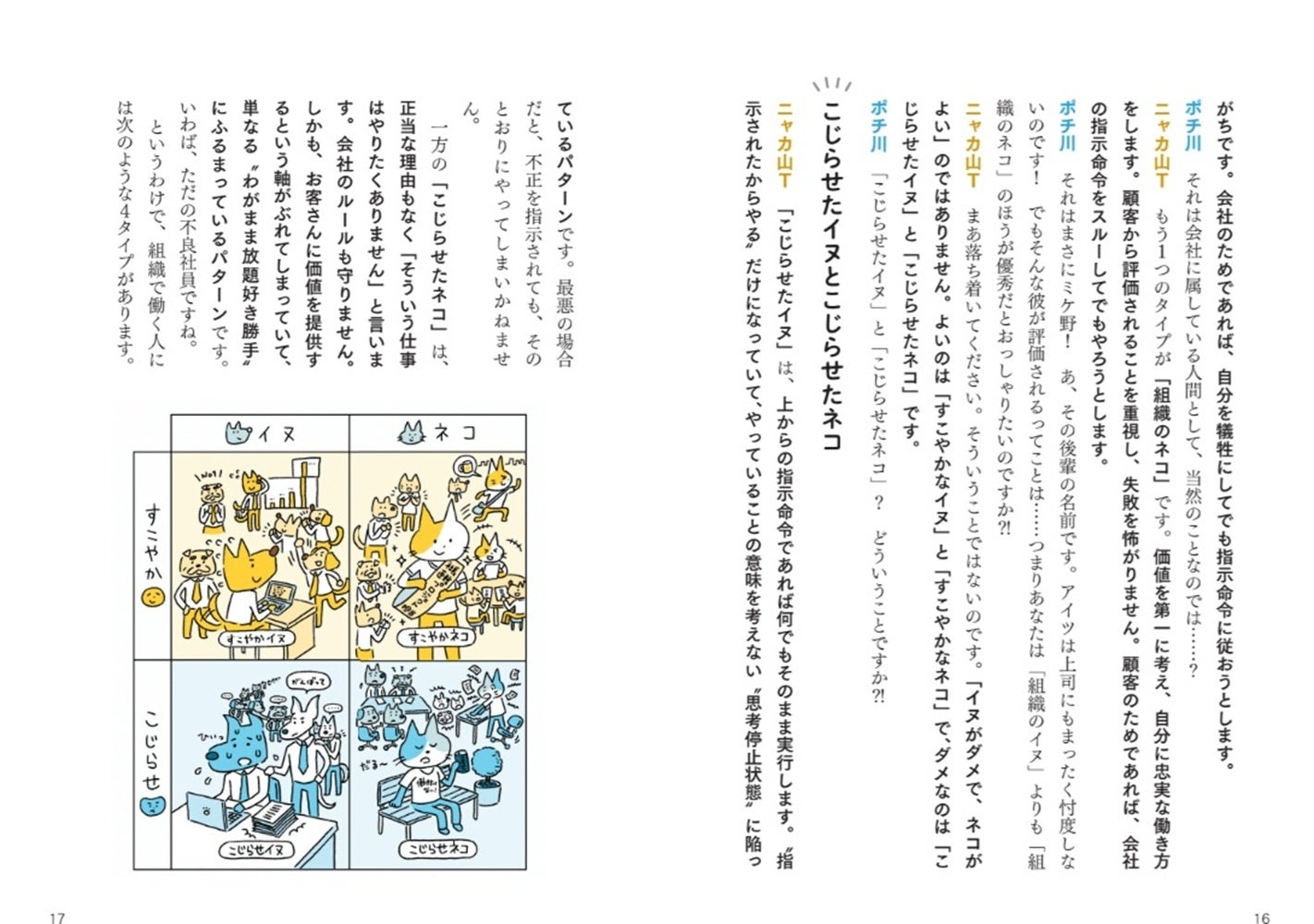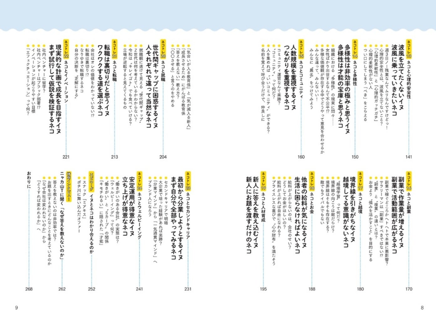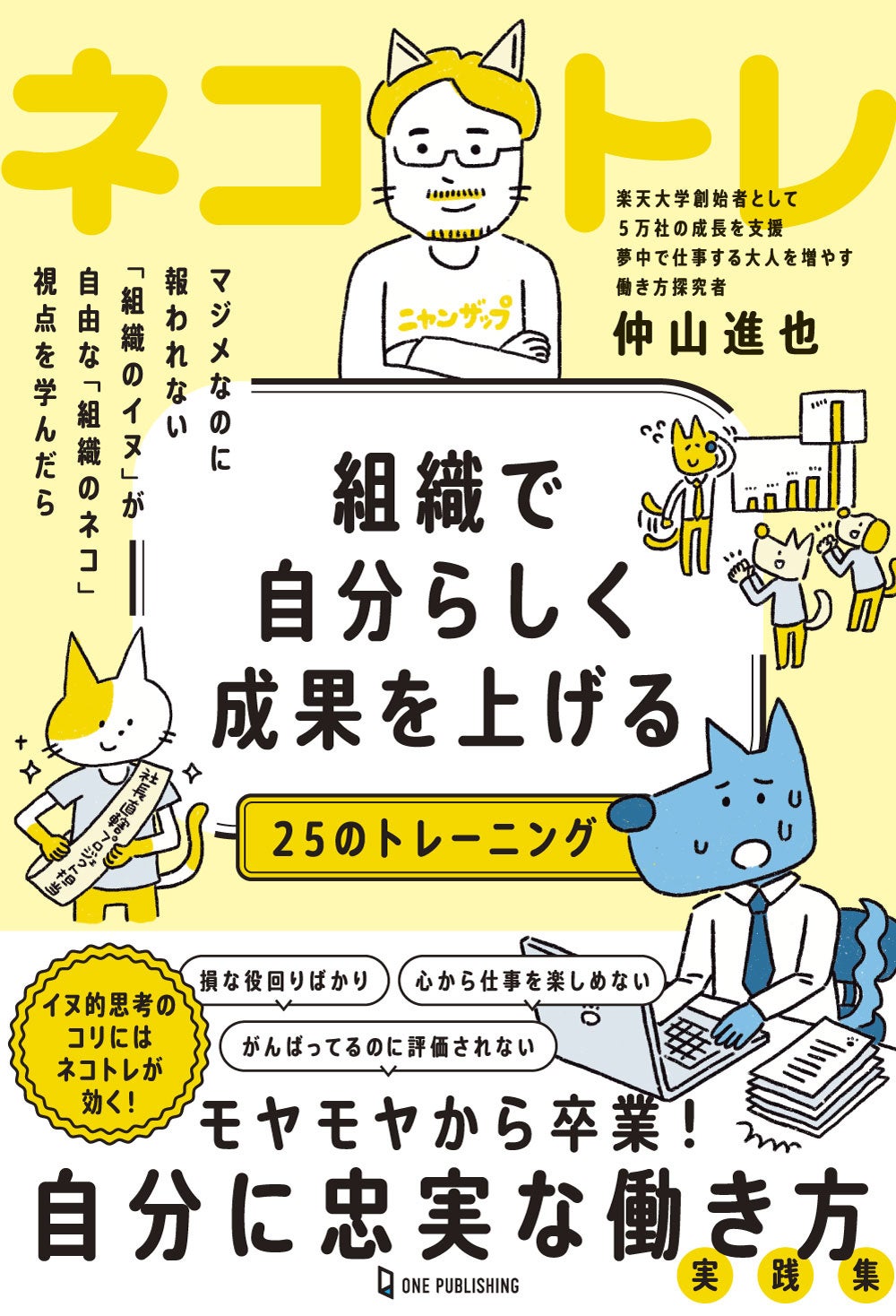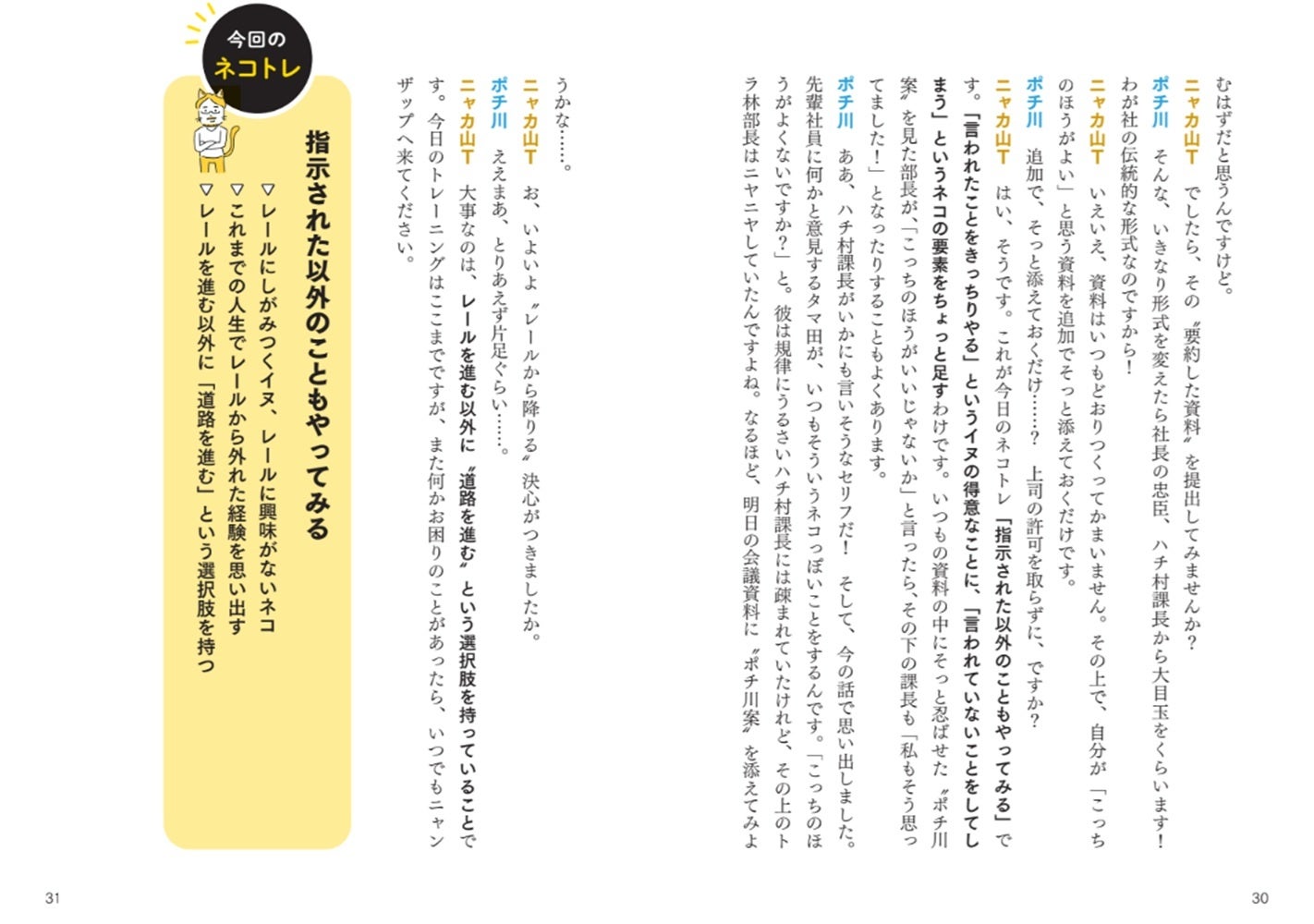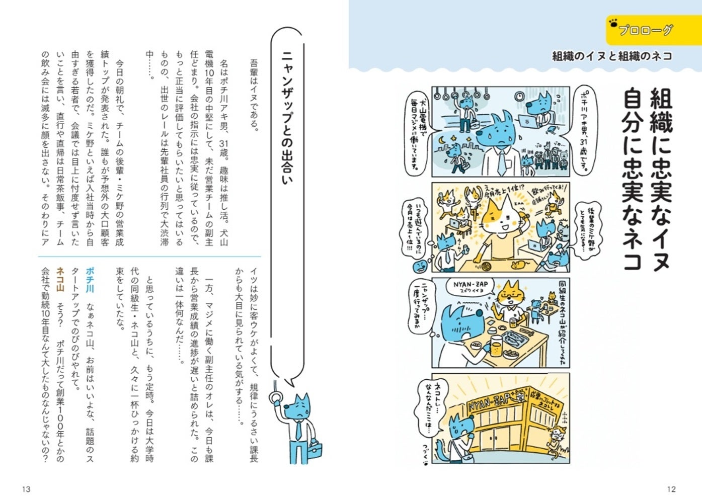 この本は「マジメすぎてこじらせているイヌ」の主人公が「自由な感じで働いているネコ」にモヤモヤを感じているところへ「ニャンザップ」を紹介され、トレーナーから25個の”ネコトレ(ネコ的思考・行動トレーニング)”を提示されるストーリー。”ネコトレ”によって新たな気づきを得られ、組織にいながらにして自分らしく働ける方法を提案しています。