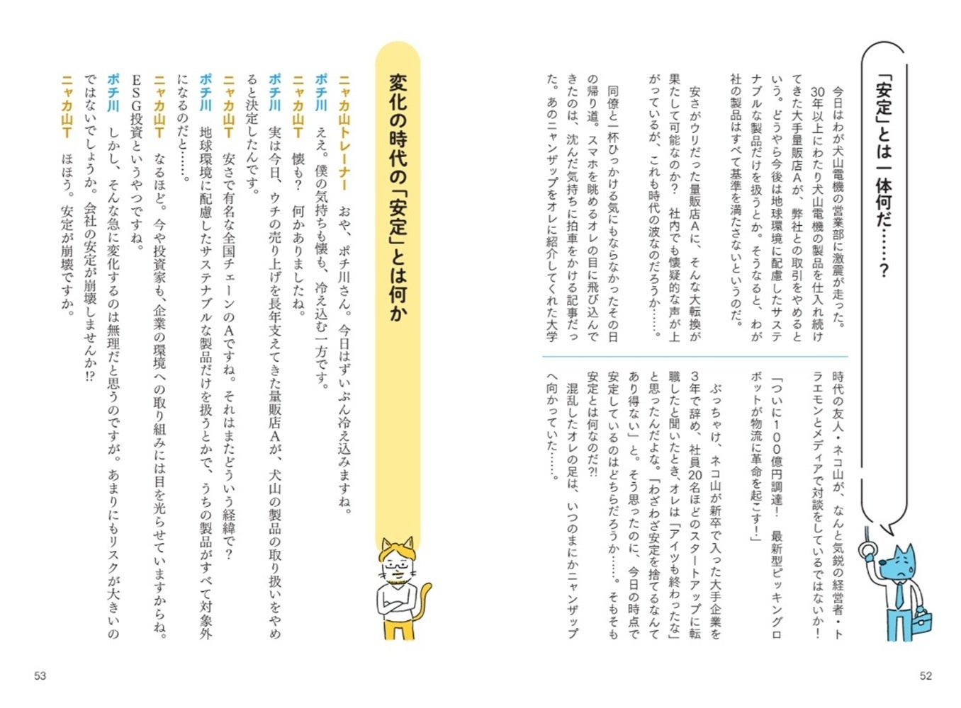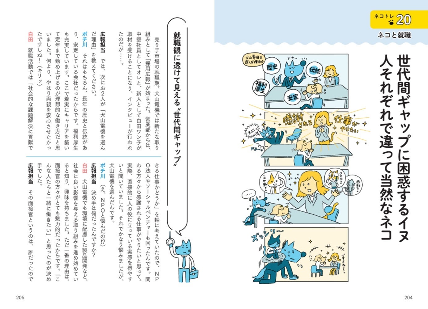 本書は主人公・ポチ川アキ男が”ネコトレ”によって思考と行動のトレーニングをしていく様を4コマ漫画や会話形式で展開。オールカラーで楽しいビジュアル、思わずクスッと笑ってしまうやりとりなどビジネス書初心者でも興味を持って読みすすめられるつくりです。主人公が入社10年目の中堅社員という設定なので、若手ビジネスパーソンにもぜひ積極的に読んでほしい一冊です。