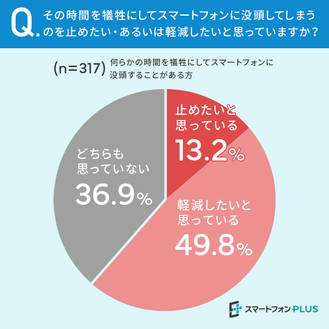 さらに、時間を犠牲にしてスマートフォンに没頭してしまうのを止めたい・あるいは軽減したいと思っているか聞いてみました。